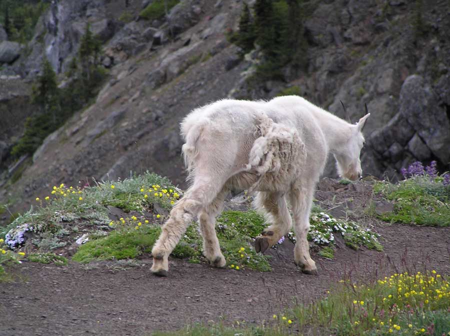 There are mountain goats, actually a type of sheep, in Olympic National Park, but they are rarely seen in this part of the park. This one was shaggy, still shedding its winter coat, but more than willing to cooperate with a photographer.