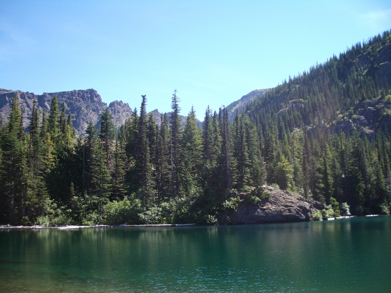 We had an amazing new experience up at Lake Angeles. We went swimming. We've been climbing the two thousand feet and then some to Lake Angeles for over five years, and each time we would get to the lake, climb the rock that sort of looks like the one that Psyche sits on in the old Schweppes logo and then turn around and march back down. This time, we noticed something different. There were people out in a canoe on the lake. We had seen tents and other hikers and even campers up at Lake Angeles before, but never anyone on the lake. We decided to wander around a bit longer, and while we wandered south from Psyche Rock, trying to keep close to the lake, one of the canoers, dressed for swimmng, told us something we had never realized. There is an easy way to get into the lake for swimming, or canoeing. A bit past the southernmost campsite, there is a path to the lake where the lake bottom is not all sloggy and muddy, and that this is the best place to get into the water. We had to try it. Indeed, the lake bottom was not sloggy or muddy, though the little stones underfoot made us wish we had packed our dive socks. Still, we were soon sloshing around in the lake, enjoying the fantastic views of the mountain wall that surrounds much of this body of water. In late August, the water was brisk and cold, but no longer frigid. It was totally refreshing, and the aches and pains of our ascent quickly vanished in the cold water. Already, we are planning our return trip, with dive socks and a towel, and hoping the weather holds so we can take another high country swim.