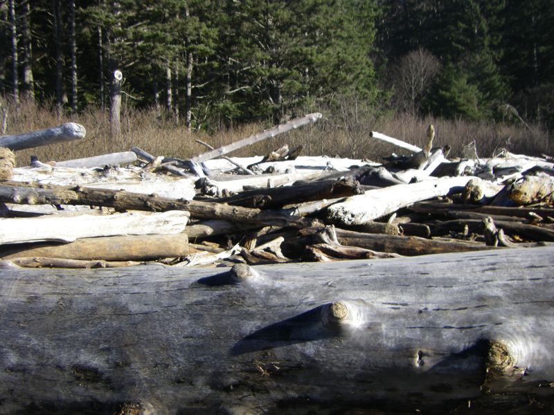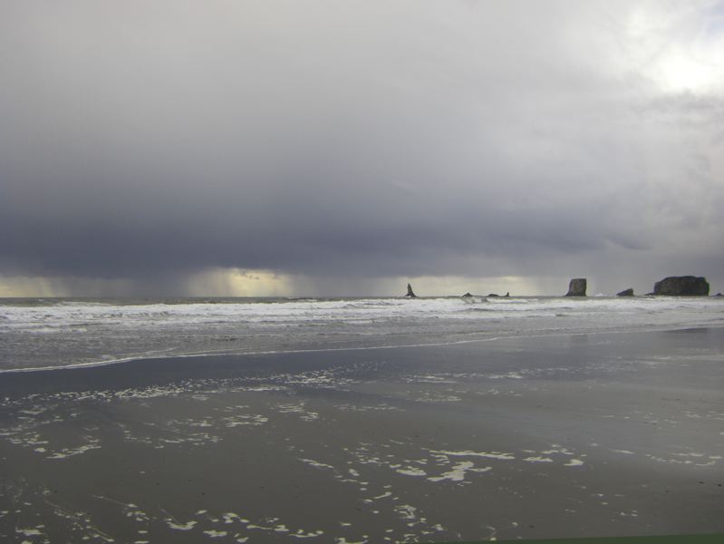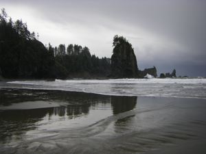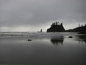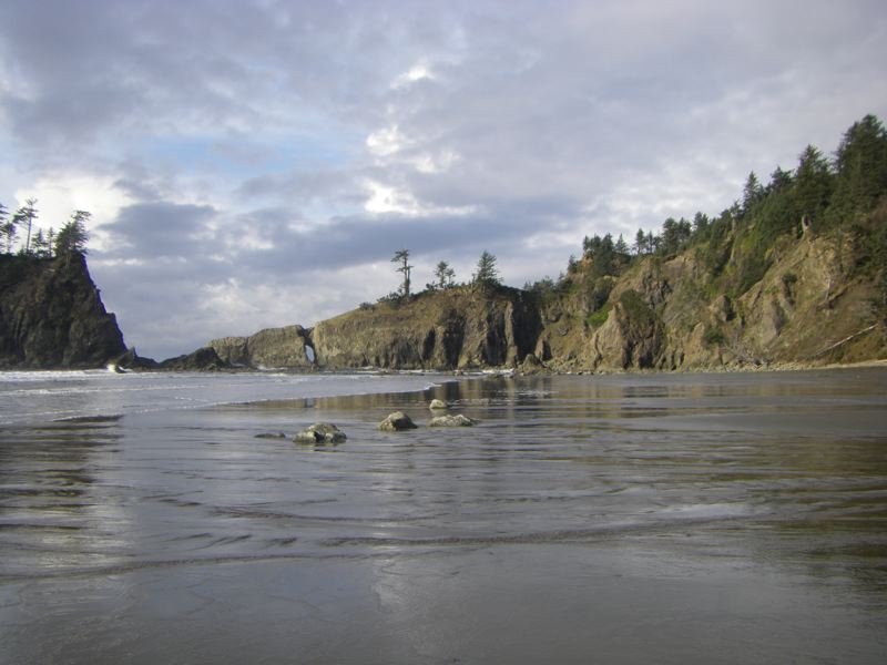 We took advantage of a brief break in the clouds and a good afternoon tide to visit Second Beach, one of our favorite West End beaches and well under a 90 minute drive from Port Angeles. We made our muddy way through the woods and encountered our first surprise at the beach. We had been expecting the usual clamber from the trail access to the beach proper, but all but a few of the logs were gone. Just as they had been mysteriously washed ashore some years back, they had been washed out to sea some time since our last visit in July.