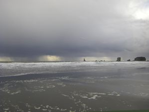 We arrived to mixed cloudy skies and a falling tide, but to the west we could see the clouds and pillars of rain closing. We sat on a log and ate our tuna salad sandwiches from Good To Go. A fellow visitor warned us the weather was changing. Then we headed south along the beach. The sky grew grayer and darker. The water was a bit high to make it to the sea cave and the wind was rising from the south. We turned about and headed back. The drizzle started, then turned to rain. At least we didn't have a monkey playground of wet logs to clamber over. We dodged to the muddy safety of the woods and made our way home.