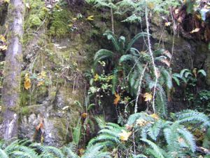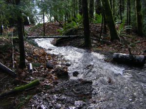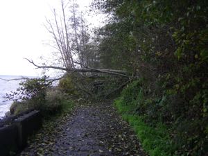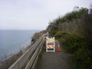The recent rains that left much of Clallam County without power for the better part of a week, and claimed the life of one of the brave folks trying to repair things, left their mark on the Morse Creek Trail as well. To start, the creek was swollen and high on its banks. There were twigs and branches all over the trail. More seriously, parts of the bluffs had collapsed sending mud across the trail. There were trees down across the trail in places, and the trail had officially been marked as closed,