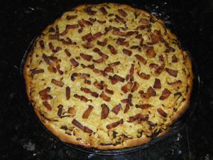 11/06 - When French Women Cook We had been neglecting one of our favorite cookbooks, Madeleine Kamman's When French Women Cook: A Gastronomic Memoir . Some of this is because a lot of the dishes call for a full cup of heavy cream. For example, the pizza like dish to the right is the Alsation version of pissaladiere. That's 3 lbs of onions in the topping along with a half a stick of butter, a full cup of heavy cream, and two ounces of prunier d'agen to give it a little kick. Those are bacon bits on top. Needless to say, one slice went a long way.