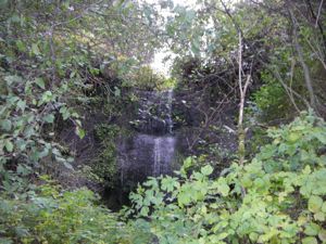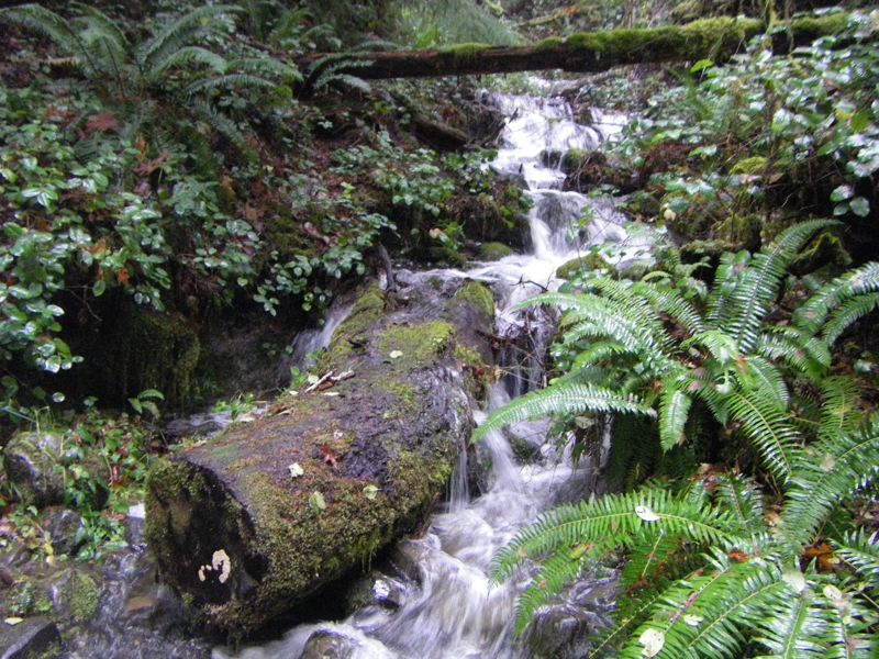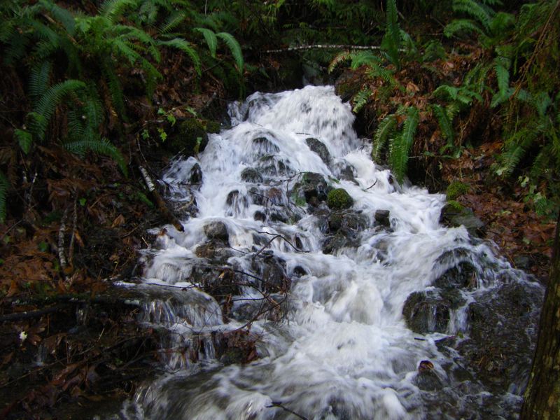 The trail was dry for a bit, though there were a few trees down. Still, there was nothing we couldn't crawl under, clamber over or slink around, but then we got to the little creek. Usually, we can just step over the little creek, but today was different. To start with, there was a little river running down the trail as a warning. We skirted this and made our way to the creek. It was a torrent with quite a waterfall. It was also fast, deep and wide, filling its channel and overflowing a bit. We puttered around deciding if it was worth fording, for there was no way to leap it, and no visible rocks mid-stream. In the end, we decided that we had had enough water for the day. It was time to turn back.