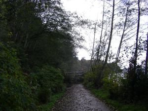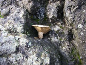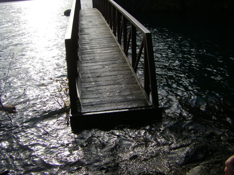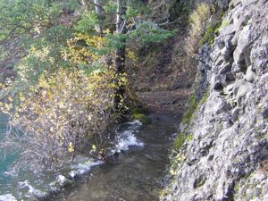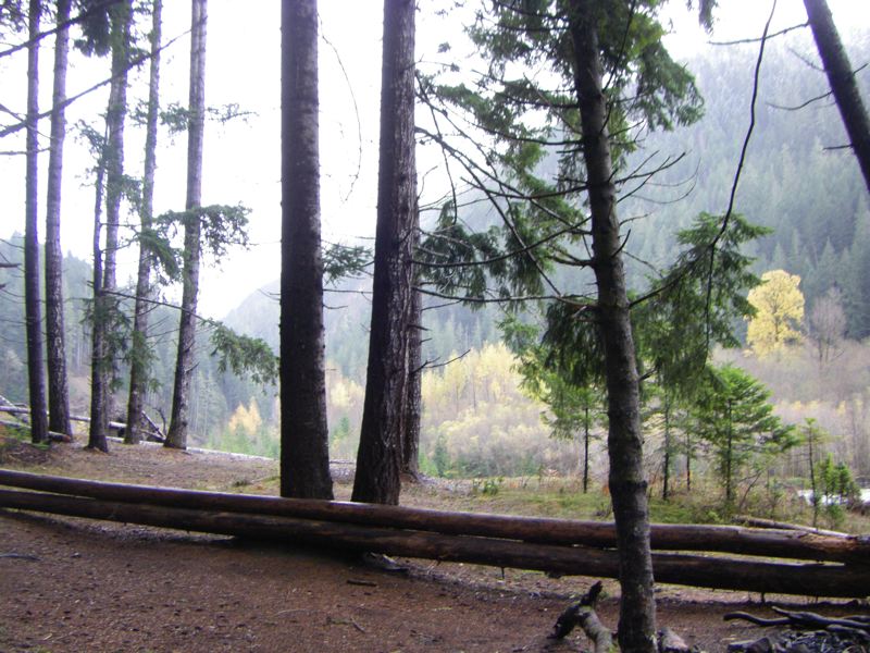 Most of the decidious trees have lost their leaves, though a few still glowed brightly yellow. We made our way down to the river canyon, but not to the river bottom. This was not the summer Elwha. This was the Elwha in full roar, though not in flood. After a dry summer, the fall rains have come.