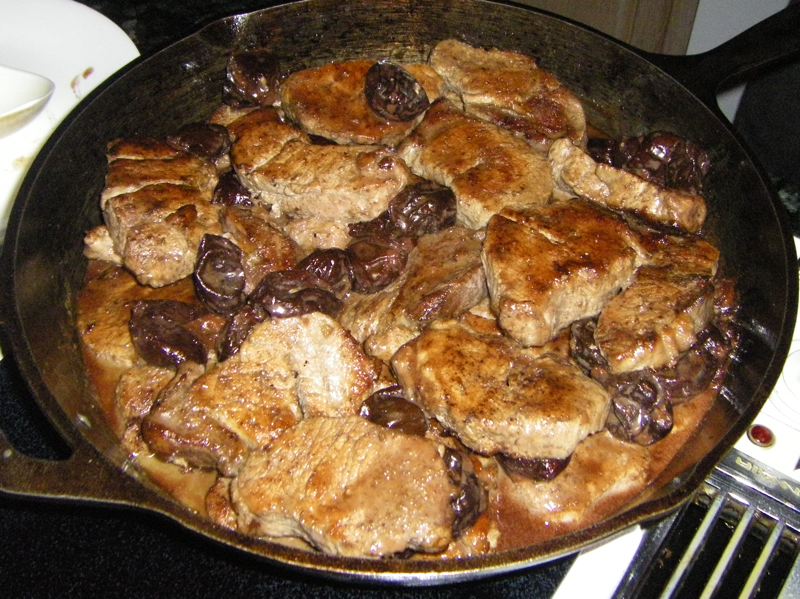 The dish to the left is a bit lighter. It is from Touraine. We sliced up a seven pound pork loin from Heritage Foods into slices and seared them in butter. That part was simple. We soaked 30 or 40 prunes overnight in a bottle of red wine, then cooked that wine down, without the prunes, to a mere cup or two. Then, in the typical French manner, we made the sauce in the pan we used for cooking the pork so we got all the cooked meat flavor. We added a cup of heavy cream, then a cup or two of veal stock and the cup or two that was left of the prune wine. Then, we cooked that down to a cup or two. Nearly six cups of liquid were cooked down to perhaps one and a half. That's why they call it a reduction, and it was a wonderful reduction with the pork and prunes.