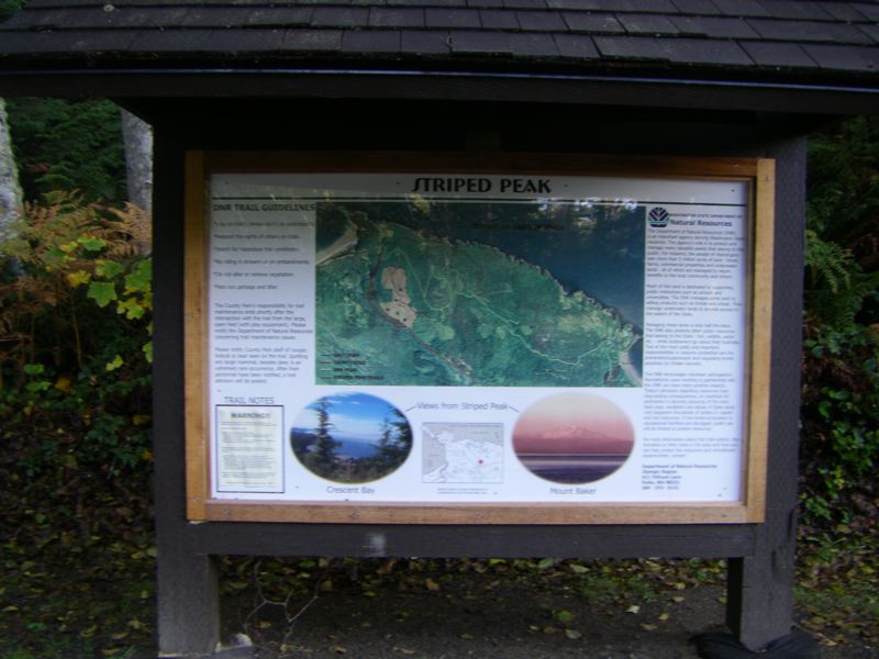 We hadn't been up Striped Peak in years. For some reason, we remembered the trail having been turned into a hard packed lumbering road, and with our tender feet we avoided it. Well, there has been some lumbering, but it doesn't seem to have affected the trail much. Yes, they have paved the little parking lot and put in a new sign. Yes, the Scotch broom along the main incline seems bigger and sturdier than ever. Otherwise, the trail is not much changed, and that goes for the mud, and for the spectacular views.