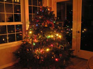 Just for the record, here are our two trees illuminated. We had to wheel out the better camera, the one with shutter and aperture control, to capture the tree light. There's probably a special mode for this on our little camera, but we can never figure out what all those modes are good for.