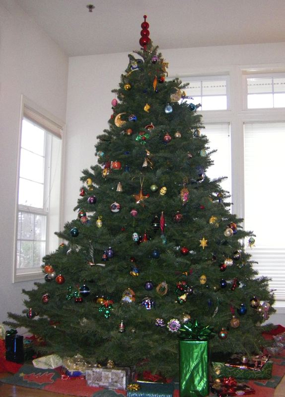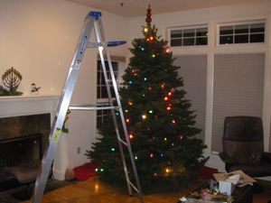 Behold, this year's monster. It has an industrial grade stand, forged in Mordor as part of the post-ring orc industry for peace program. We've decked it out with lights. That took a two stage power distribution system with a sub-terminal located about 2/3 of the way up the tree to power the upper strands of LEDs and conventional lights. We needed that ladder to get the spire and upper ornaments in place.