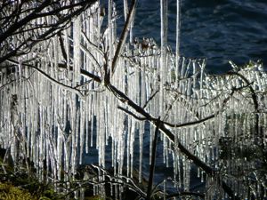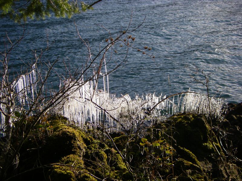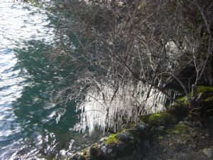 The icicles along the Spruce Railroad Trail are back. We last noticed them back in March. They are as beautiful as ever, especially with the lake's blue waters behind them.