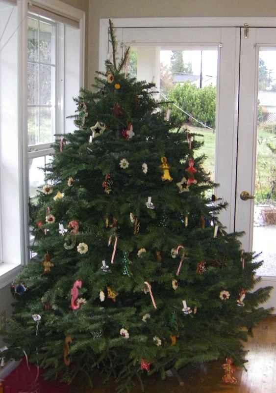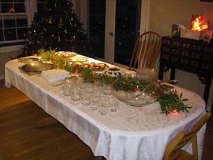 December has been a busy month with parties, travel to Seattle and lots of excitement. We've also been decorating Chez Kaleberg and our Christmas trees. Here are a few pictures of our two trees. The big tree is a nine-footer and neatly fills a corner in our living room. The little tree is decorated with cookies, our friends' creations, and is lighted with candles. That's our Christmas party spread to the right. We'll post more pictures when things calm down a bit, most likely around Christmas later this week.