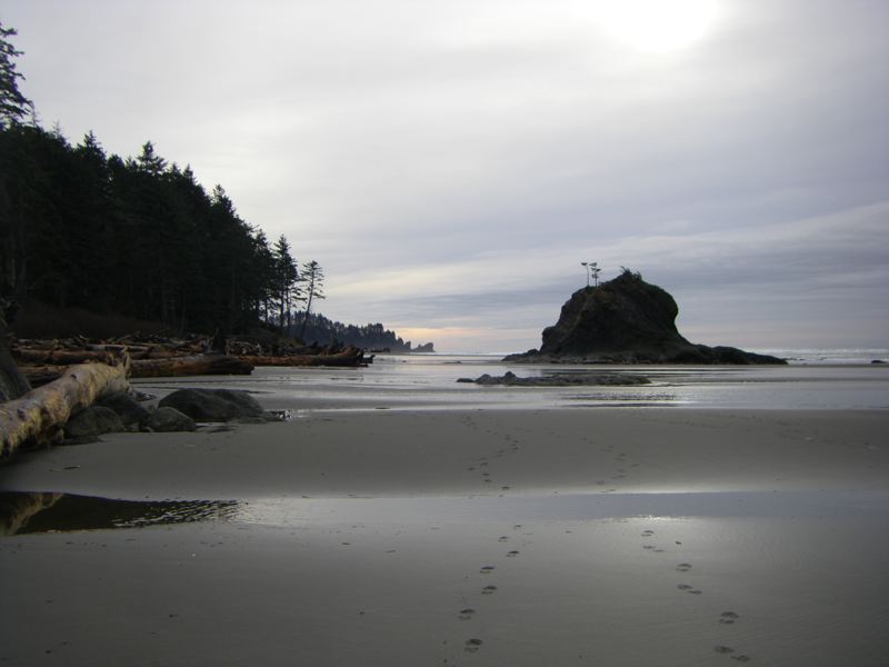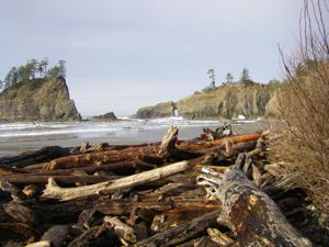 The driftwood is coming back to Second Beach. If you click on the second beach keyword, you'll see that we last reported an almost complete lack of driftwood between the trailhead and the beach. In fact, you could just step down from the trail to the beach with no further ado, but now the driftwood is coming back. It's nothing like it was last summer where one had to clamber over log after log, but there is a nice collection of logs piling up.