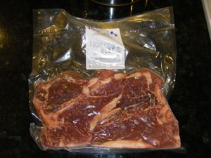 We noticed a newcomer at the Port Angeles Farmers' Market this past Saturday, the Clark Farms beef people. They had a sign, some nice brochures and a big freezer pack full of beef. We had to try some, so we bought a pair of t-bone steaks, nicely packed and frozen. We put them to the test at Kaleberg Laboratories. That meant a session in the microwave for thawing, then heat processing in our broiler, not far from the electric coils. We applied hard infrared to push our sample to medium rare. That's a technical term.