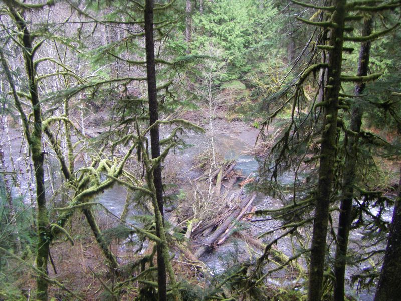 Marymere Falls is one of our "too lazy" hikes. It's about 45 minutes round trip, including gawking at the falls. As usual in the winter, the falls were roaring. See the arty pseudo-panorama to the right. Eventually, they'll get cameras for taking pictures of stuff like this, but for now we can be arty.
