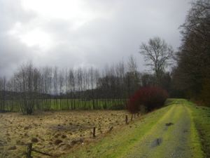 We often take the Olympic Discovery Trail from the parking lot off Four Seasons Road and head east towards Port Angeles. There are nice views and good bird watching along the waterfront parts of the trail, but the winter rains make the high bluffs above unstable. The waterfalls may be lovely this time of year, but it's the water that makes the bluffs crumble. We picked our way through this tumble of trees and mud, though sometimes we just regard it as a sign and turn back. Despite this hazard, it's a great trail for this time of year. When the sky is open enough it matters less that it is gray.