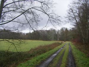 The trail through the forest, covered with snow.