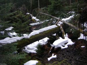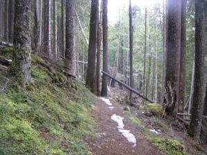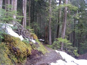 The snow on the Lake Angeles Trail seems to come and go, but lately it has been going. We haven't nerved ourselves to cross the little bridge yet, but we've made a few trips that far already, and surely, we'll cross that bridge on our very next trip, or the one after that.
