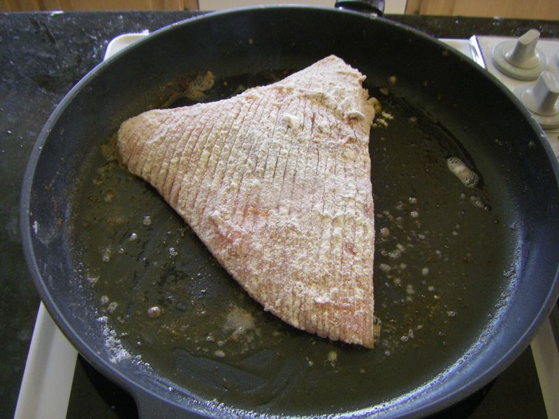 They had skate wings at Sunny Farms. They had just been caught the day before. We love skate wings, but rarely get to have them. We dredged ours lightly in flour then cooked them up with butter and capers. It's a simple dish, but it captures the richness and real flavor of the skate. If you like black cod, you will probably like skate. The only downside is the numerous gelatinous bones. Unless you are a big fan of duck's feet or cock's combs, you'll probably want to remove the bones carefully. (They are a good source of calcium though.)