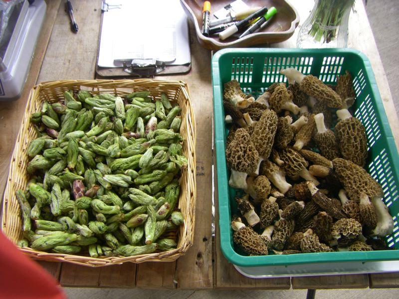 Preston, of Wild West Seafood, also sells wild foraged products. This week he had morels and devil's claw shoots. Devil's claw is a pretty nasty looking plant, and never seemed particularly appetizing. Still, these little shoot lookd interesting. Preston says they have a pine-y flavor, and we suspect that this might be a bit much for us. Still, they'll probably be appearing on a number of spring menus along with the fiddleheads. We were tempted, by curiosity, but we'll pass for this year. There were too many other good things at the market.