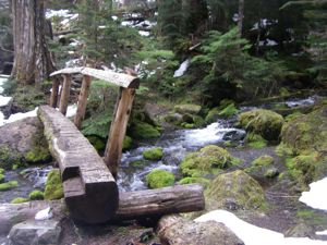 We have been trying to get into shape for when the high country finally reopens, likely in August. This entails climbing, and our favorite get into shape for climbing trail is the Lake Angeles Trail. This time, we broke our seasonal record, not only crossing the bridge at 720' apl, but we made it all the way to 1200' apl. That's half way to the lake, which we gather is still surrounded by deep snow. When will we make it to the lake? At the rate we are training, likely in August.