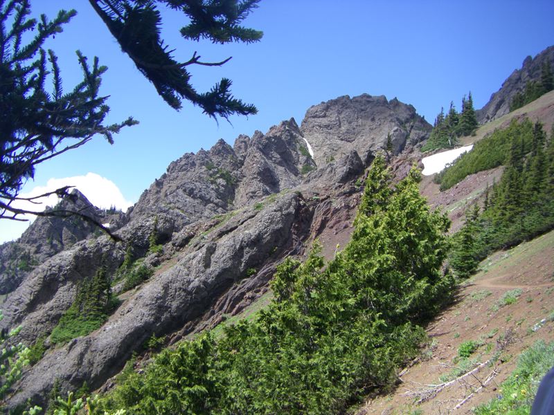 We even saw a family of mountain goats safely perched on a snow ledge far away and above us. That's about the right distance. That's why we bring binoculars, not that the Klahane Ridge climb is in need of scenery what with the distant mountains, alpine flowers, rocky crags and great sky.