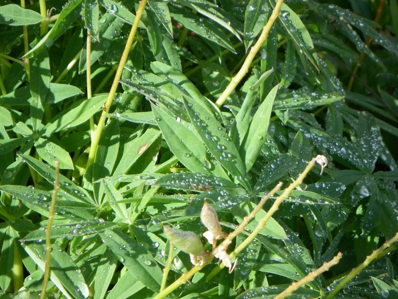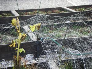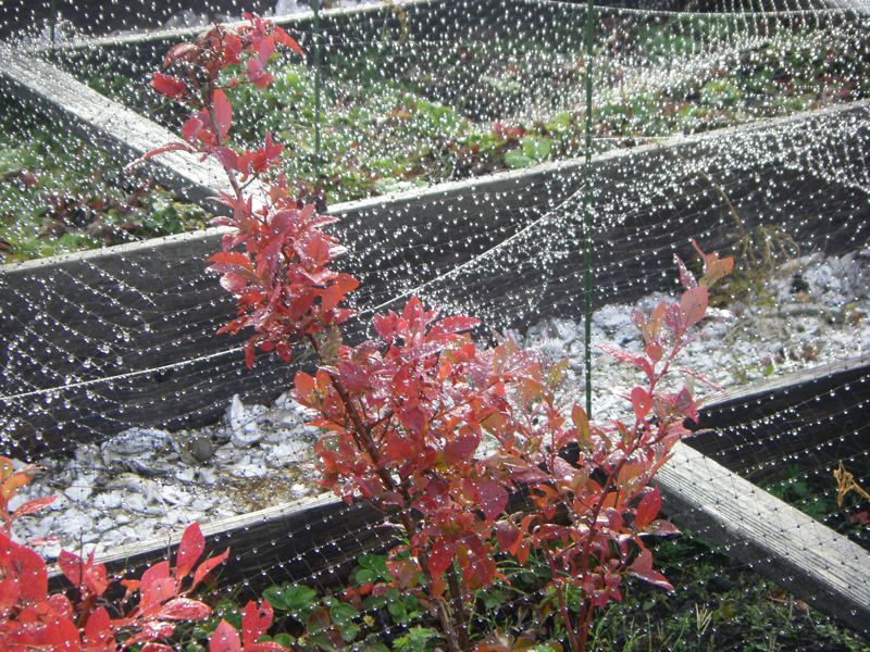 The bird netting on our strawberry boxes had collected great glistening beads of rain. Usually, bird netting is pretty ugly, but the autumn rains and morning light made it something special.