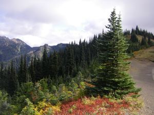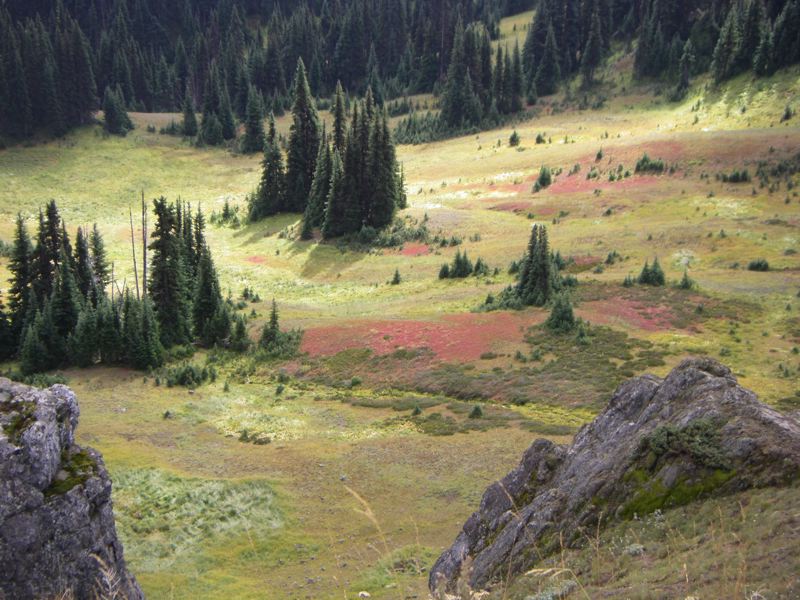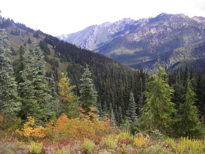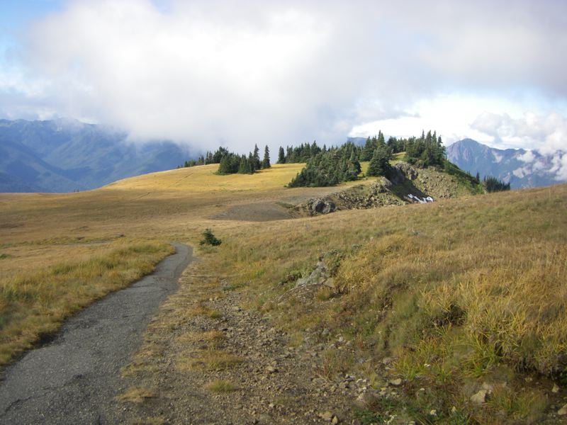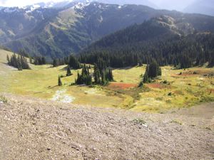 The short, wet summer kept the hillside vegetation green late into September, but now it had all turned to gold. Here and there we could see the fall colors with browns and golds and here and there brilliant red. Above us loomed the bulk of Hurricane Hill, its summit dusted white above us.