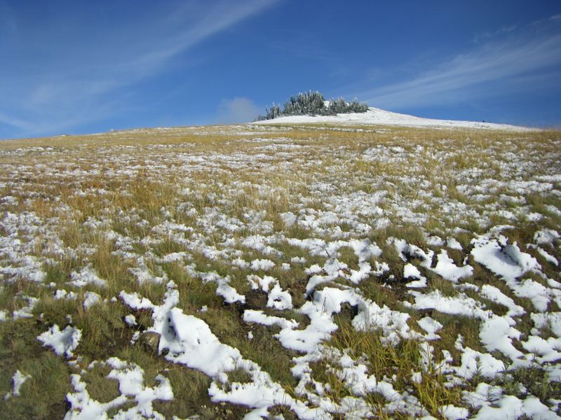 We walked through autumn, but as we ascended, panting and wheezing as is our wont, the season changed on us. First there was first snow by the trailside, then on the trail itself. The golden grasses were covered with a lacework of light snow. It grew colder.
