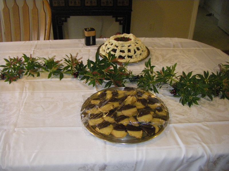We lay out of few set pieces - half and half cookies and the fruitcake - while horticultural takes a whack at those shrubs out front for wire hiding foliage.