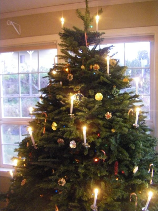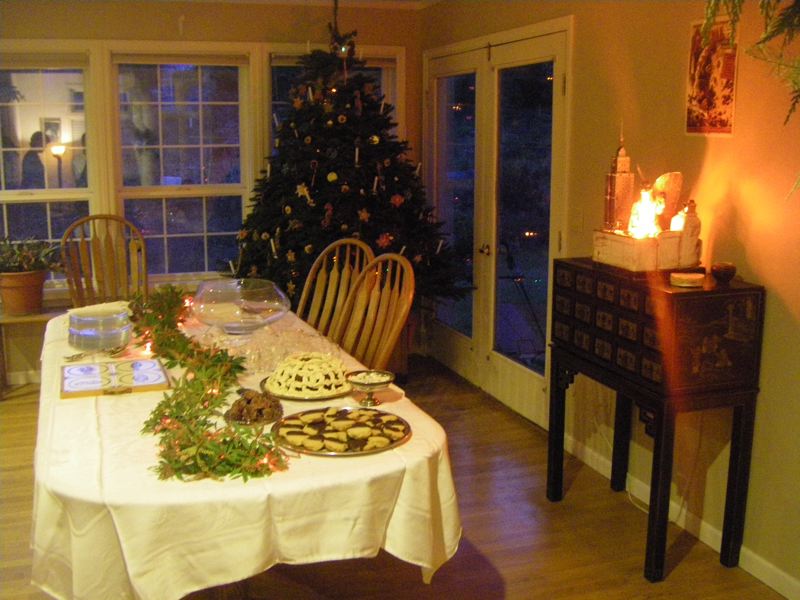 We've already made the cookies. We'll be decorating the gingerbread cookies for the small tree later today, but we already have a big pile of almond spritz cookies, and we've started putting them on the tree. These are strictly decorative. You can eat them, and they aren't awful, but they are a bit bland and not to everyone's taste. (How's that for being diplomatic?)