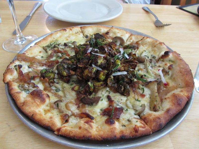 Alder Wood Bistro is back up and running, and Gabriel is creating some amazing food. For example, consider this brussels sprouts pizza. It might sound a bit strange, but Clallam County is a major producer of brussels sprouts and brussels sprouts seeds, so these are one of our amazingly good local variants. Then, they've been caramelized, cooked until they are browned and tender along with some bacon, onions and little mushrooms. It's a wonderful dish. We liked it so much, we ate one large pizza at the restaurant and took one with us to go.