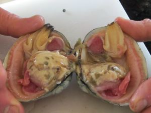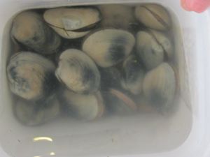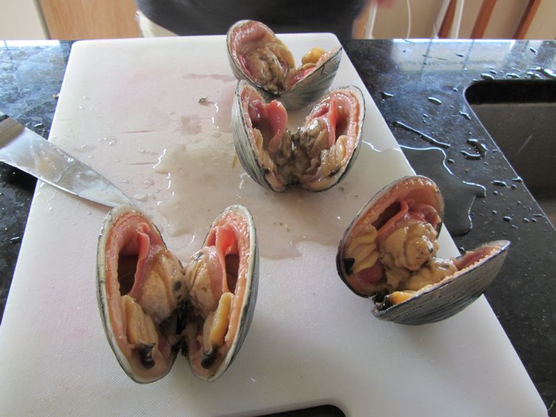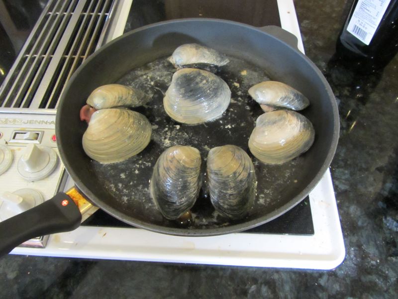 A friend of ours dropped by with a bucket of butter clams. We had never had these before, so we followed his recipe and sliced open each clam, then placed them open side down in a hot, buttery pan and weighted them down with a cast iron skillet. Then we added the usual garlic, salt and pepper. The results were magnificent.