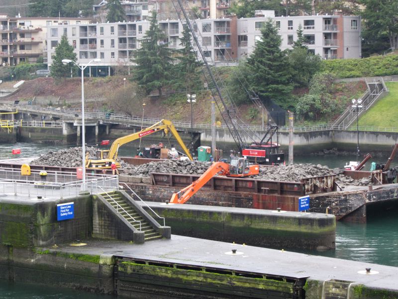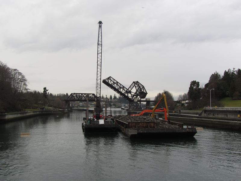We recently took a lightning trip into Seattle, and made our way to the Ballard Locks in hopes of seeing our favorite winter garden. We were a bit early for the richly scented winter daphne, but there were some magnificent witch hazel trees and a fair bit of industrial action. It was like something out of a children's book with the locks cycling, the diggers on the dredging barge hauling up rocks and the railroad bridge opening between mile long trains.
