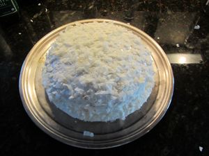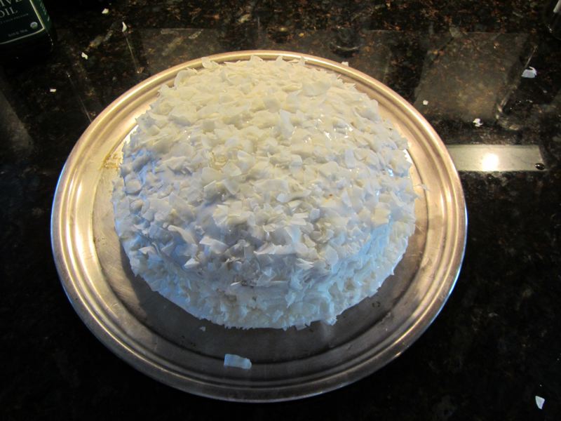 This is basically a classical coconut layer cake with boiled icing and coconut flakes, but with a rich center of home made lemon curd. We used Edna Lewis's cake recipe and the lemon curd recipe from Great British Cooking.