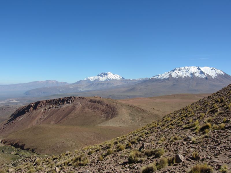 We were originally going to take a serious hike, down a hillside, along an old road then through a canyon and up to the geysers. There was a beautiful view of the mountains, but we were at 15,000 feet. Our nerve failed us, so we decided to head back to the thermal field where the geysers were and take a five kilometer (three mile) hike on level ground.