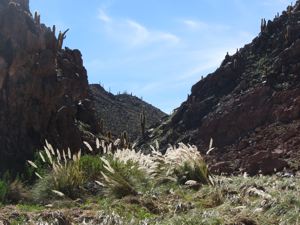 We made our way down the rocks to the canyon floor and walked, clambered and crawled upstream. Now and then we'd leap the stream or scramble over the rocks to bypass a waterfall. It was moist in the canyon, with tall cactus about along with a broad variety of plants, many in flower. There were also big clumps of pampas grass, many six or eight feet tall, and we'd sometimes have to fight our away upstream through thickets of them.