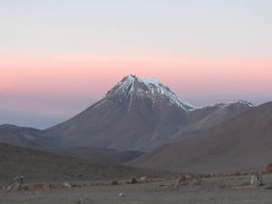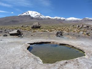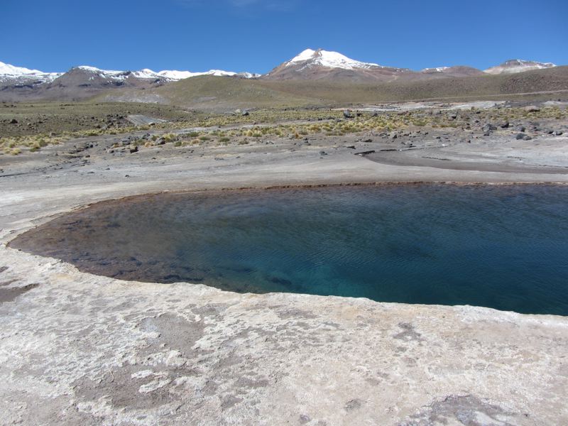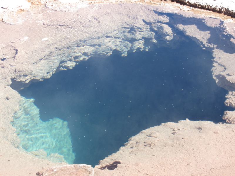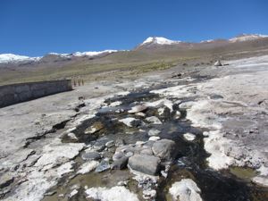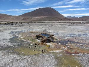 Most people go to see the Tatio Geysers at dawn. We had already seen an Andean dawn at our own private salar, so we went to see the geysers later in the morning. En route, we passed tour bus after tour bus, all heading back from their dawn excursions. By the time we arrived at the geysers, there was one other car, a Belgian family with one of those biycle campers soaking in a hot pool, and the caretakers.