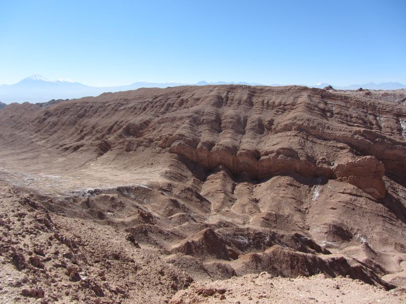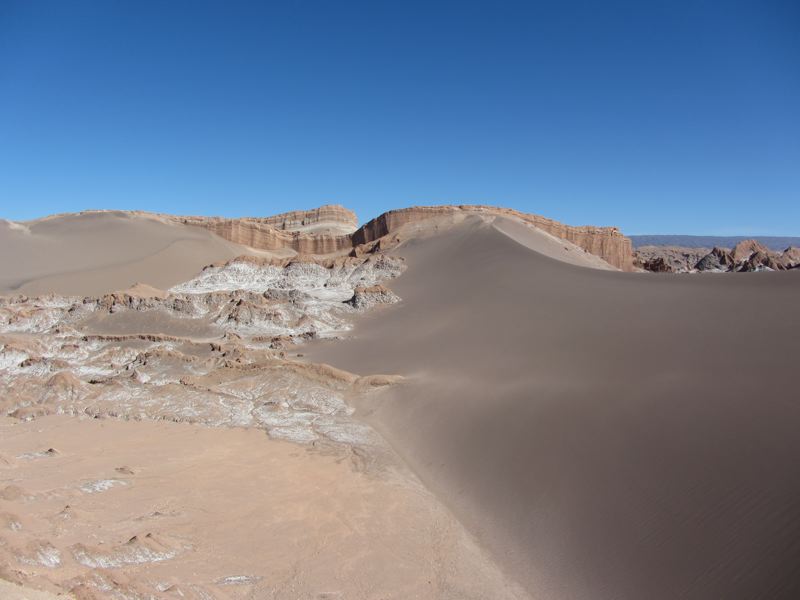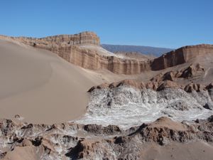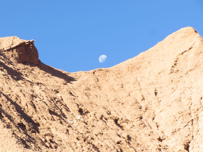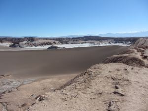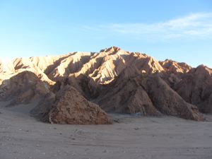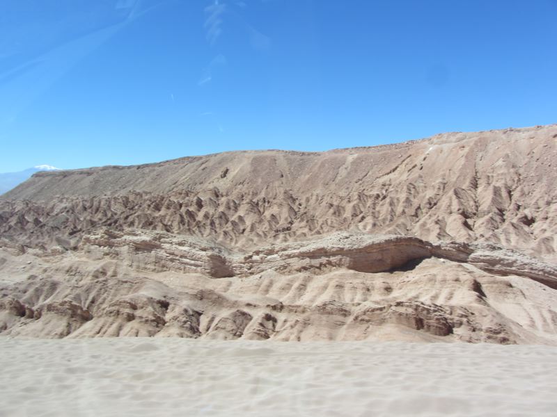 The Valle de la Luna is not far from San Pedro de Atacama where we are staying, but it is an exotic landscape as the name implies. The hills are covered with crystals of salt, calcite and gypsum, or common sand depending on the wind and weather. Despite being in a hard desert, there are rains, and they, with the wind, shape the land.