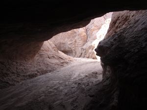It followed the Creek's canyon, carved into soft rock and mud. There were gypsum intrusions and slot canyons and little caves that were carved by the bend of the stream. We were climbing slowly all along. The canyon changed and grew more open. We saw our first plants, scrubby bushes along our way. We could also see the moon rising over the canyon wall. It would be our companion for much of the journey.