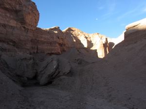 The canyon widened and we started seeing more plants, though not all that many. The sun was setting, throwing the canyon into shadow. The moon was rising. We had made our way up via Devil's Creek canyon, and now we were returning by Catarpe, a parallel canyon.