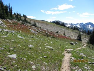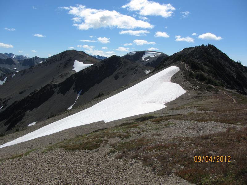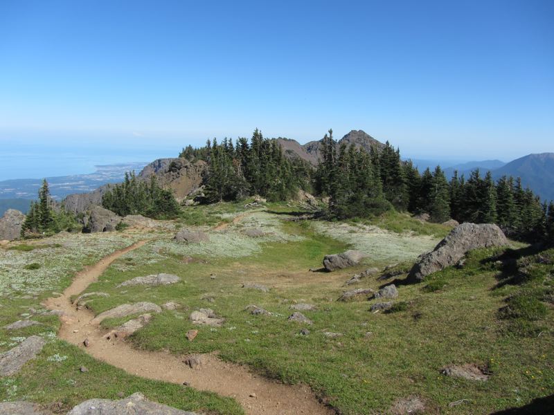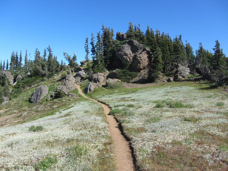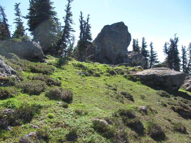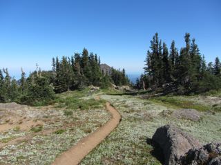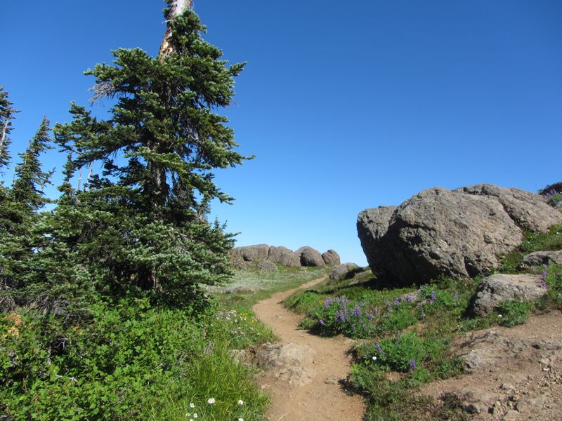 The trail heads across the usual sloping alpine field until you get the rocks, the gateway to a series of rooms, each with its own carpet of ground cover and its own arrangement of rocks and wind twisted, stunted trees as furniture. We think of them as rooms, though often the walls are transparent, presenting fabulous views north and south, but framed by the presence of the space. We almost always explore the first few great hallways, but sometimes we continue until the trail starts its descent to Lake Angeles in earnest and then turn around.