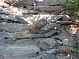 We even had a great marmot sighting on our climb up the staircase. The first glimpse was of the marmot racing up the stairs and around a bend. We figured he or she would be safely hidden under a rock or bush by the time we labored up the steps, so you can imagine our surprise to find the little guy right on the steps relaxing and enjoying the shade.
