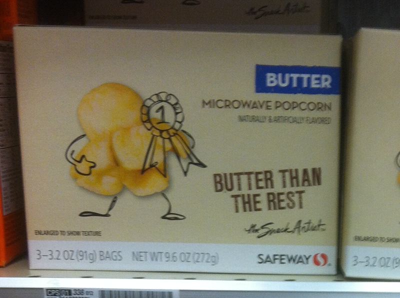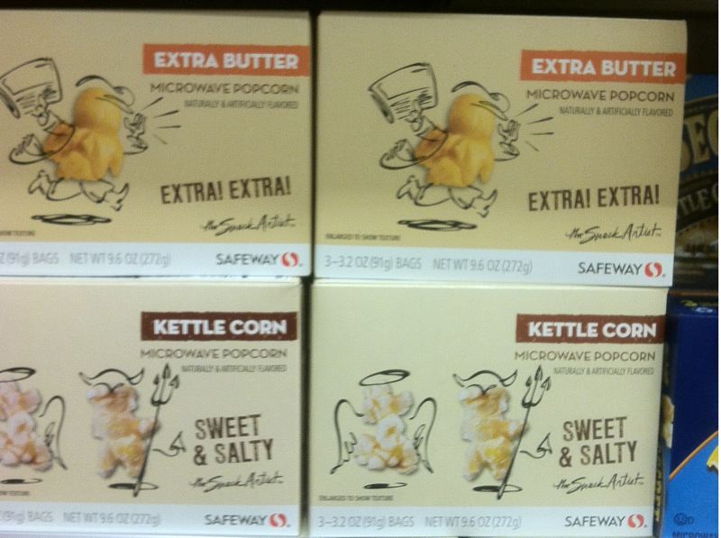 We aren't sure who designs these boxes of store brand products, but someone must be having fun. We've already posted on the various cereal clones, but now the house brands are taking over the popcorn shelf with horrible puns. You'll notice the packages are shaped just like the major brands, but the labels are quite distinctive.