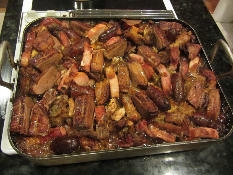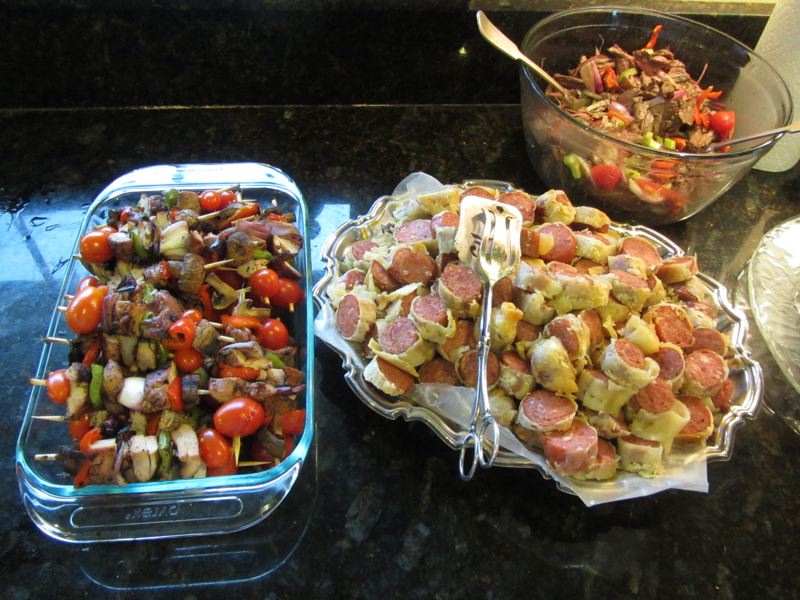 Chicken kabobs, saucisson en croute, skirt steak salad