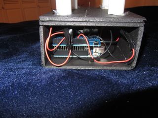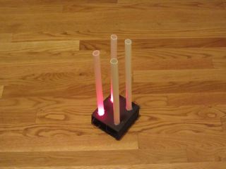This was a last minute Christmas present suggested by most recent flight back from Seattle. The climb out of Boeing Field takes one over an industrial area south of Seattle. It doesn't look like much by day, but there are all sorts of fascinating lights by night. One set was hypnotizing, a set of four columns lighted two at a time, moving about an invisible shape. A quick trip to the Radio Shack provided an Arduino processor and some red LEDs. JoAnn's fabrics and hobby supplies next door provided four plastic columns for supporting elaborate wedding cakes. Add in a glue gun, a soldering iron and some black foam board, and there was something new under the tree. Be sure to click and watch the dark video. It can be hypnotic.