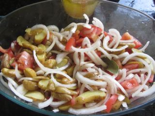 Potatoes, tomatoes and onions - We "parboil" the potatoes in the microwave.