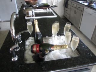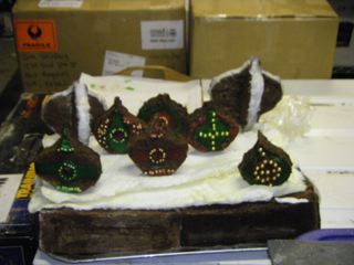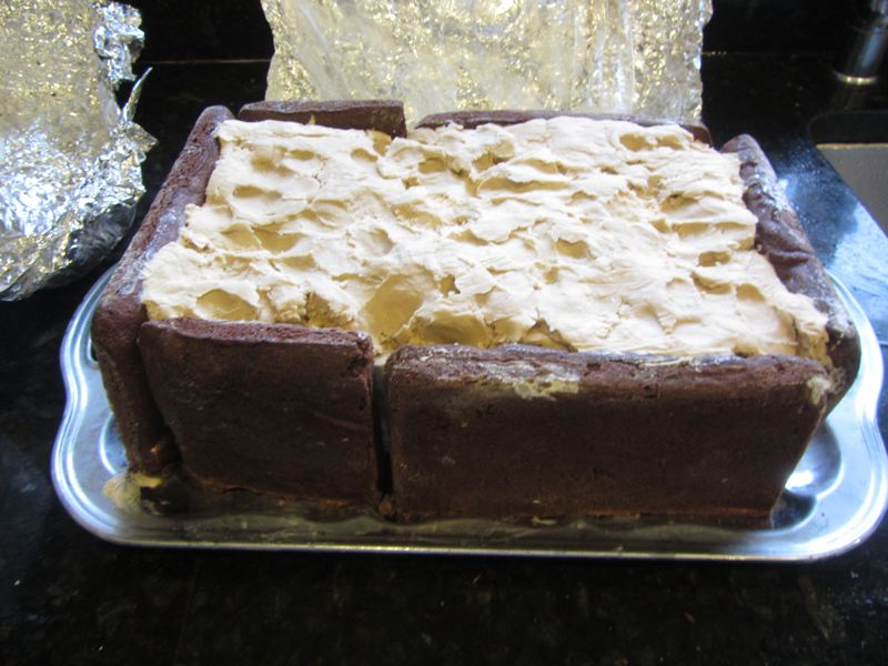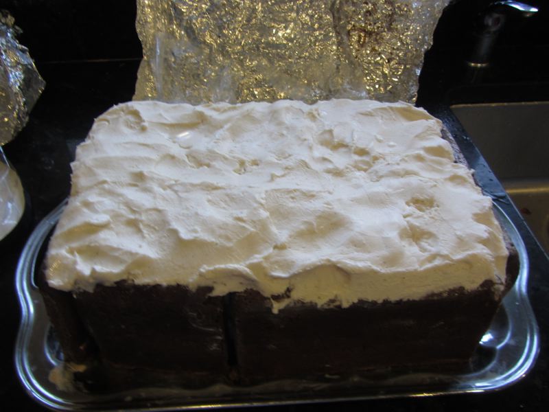 We perform this as a set piece. We serve a Baked Alaska made of brownies and coffee ice cream and topped with a meringue, though this year we had good luck using vanilla ice cream. Every year the domes signify the domes of the St. Basils in the heart of Moscow, and every year the flames of brandy adorn the city as part of its last ditch defense while the 1812 Overture plays in the background.
