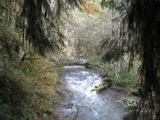 We were lazy today, so we took a short hike at Marymere Falls which flows into Barnes Creek not far from the south shore of Lake Crescent. Despite the government shutdown, the Barnes Creek parking lot was open, though the ranger station and bathrooms were closed. The rain forest and the river, however, were in full operation and, with today's peep of sunlight, quite beautiful.