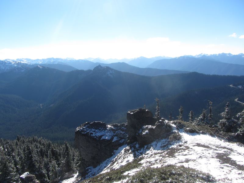 At some point it became apparent that we were likely to make it to the ridge. We had a clear view of Mount Olympus over Sunrise Point. It was exhiliarating. Then we made our last switchback and made our way to ridge proper, passing between the rocks. Before us was the sweeping view of the strait, of the islands, of Vancouver Island, of Mount Baker and, it seemed, everything. We approached the overlook, and the wind struck. It had been windy at Hurricane Ridge, imagine that, but our climb had been warm and sunny with the icicles glistening as they melted. Here, we were unsheltered, on a ridge, again. The wind blew hard and cold. It was a winter wind.