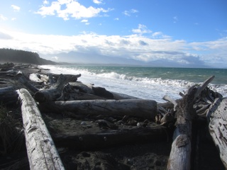We usually hike the Dungeness Spit at low tide. There always seems to be lots of beach, and the piles of driftwood are way above the beach where we are walking. This time of year doesn't offer very many good tides during daylight, so we took a walk near high tide. This meant walking on the narrow strip of land around the piles of driftwood. There was some beach there, but the high tide and wild water made it rough going.