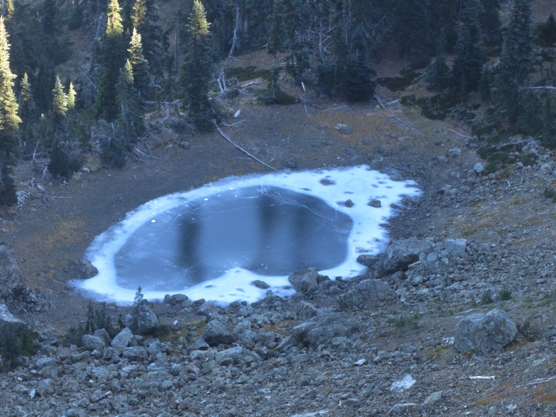 Exploring more, we found the catchments, collections of log and stone that held back the steaming sulfurous waters and formed inviting looking pools. We stopped to explore several of them, but we were too tired to soak. There was plenty of steam, and the whole area seemed warmer. There was some frost on the trail, but not where the hot springs ran.